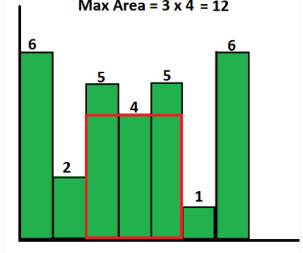 히스토그램이 좌측과 같다면 여기서 최대 직사각형 넓이는 4*3 = 12이다.(모든 직사각형의 width는 1로 가정한다.)