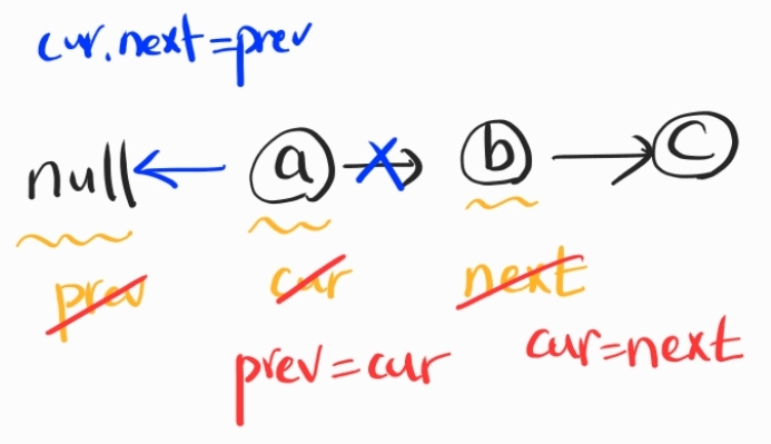 이전 노드를 저장할 prev라는 노드를 만든다. 현재 노드(cur)의 next를 미리 저장해놓는다.