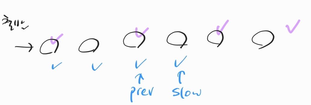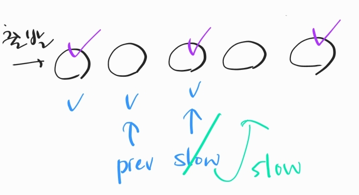 prev는 왼쪽 리스트 순회, slow는 오른쪽 리스트를 순회한다. 연결리스트 길이가 홀수일 경우 slow가 한칸더 이동해야 한다.