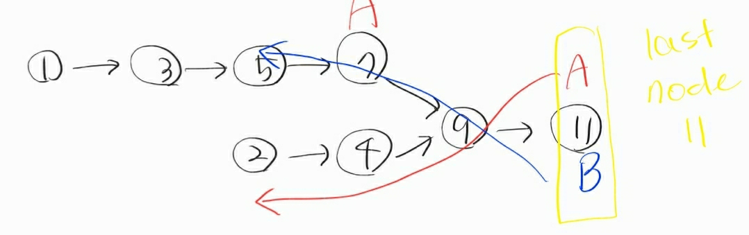 리스트의 길이를 비교해서 출발지를 맞춘다. 위 예시에선 A가 2만큼 길기때문에 pA를 뒤로 두칸만큼 뒤로 밀어서 다시 두 리스트의 traverse를 시작한다.