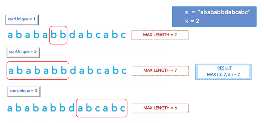 Input: s = "ababbc", k = 2 Output: 5 The longest substring is "ababb", as 'a' is repeated 2 times and 'b' is repeated 3 times.