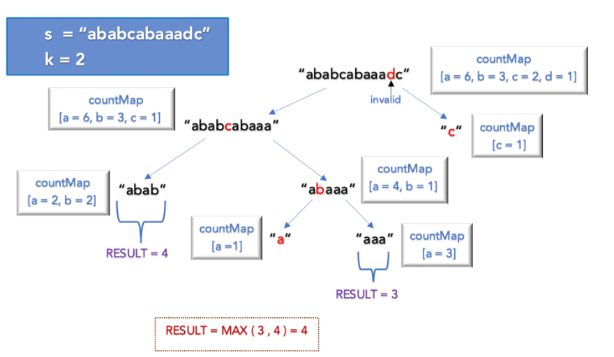 return Math.max(recursive(s, start, mid, k), recursive(s, next, end, k));