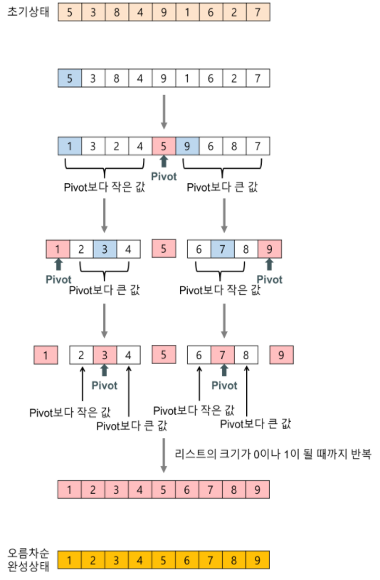 1. pivot이 있고 (보통 배열 왼쪽 끝 혹은 오른쪽 끝 값)