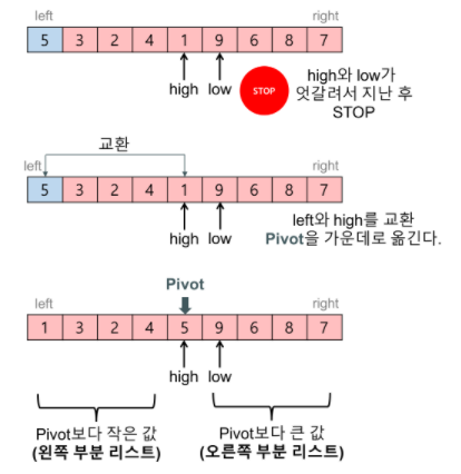 3. 작은값, 큰 값 교차 지점에 피벗을 놓는다.