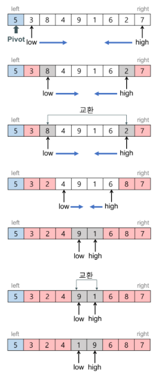 2. 피벗을 중심으로 좌측엔 피벗보다 작은값, 우측엔 피벗보다 큰 값을 배치한다.