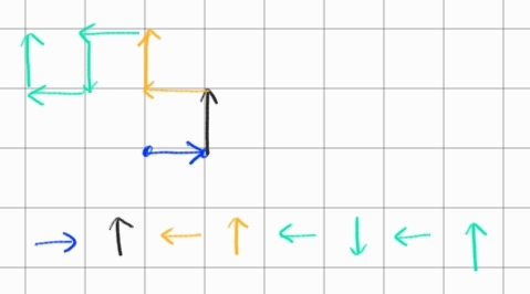 주어진 예시에서 방향에 주목하여 문제를 풀어야 한다. 다음 그림은 예시에서 설명된 드래곤 커브의 방향을 세대 별로 색을 달리하여 나타낸 것이다.