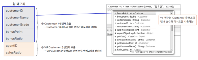 VIPCustomer() 생성자 호출로 인스턴스는 모두 생성되었지만 타입이 Customer이므로 접근가능한 변수와 메서드는 Customer로 제한되어 있다.