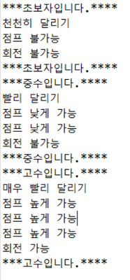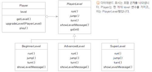 Player가 게임을 하는데 Player의 레벨에 따라 run(), jump(), turn() 세 가지 기능을 할 수 있다.