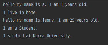 Student student1 = new Student("jenny", 25, "anam", "Korea");